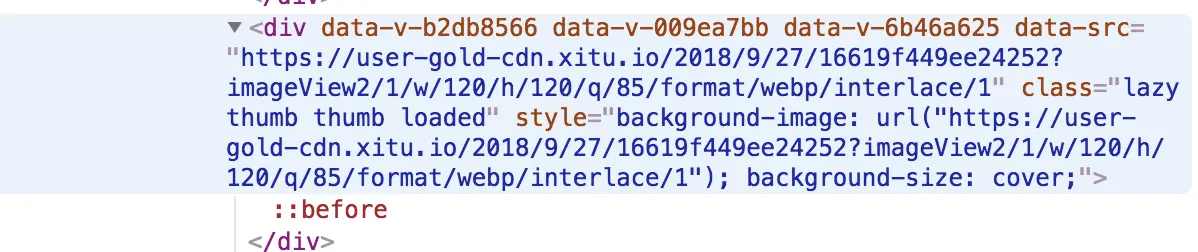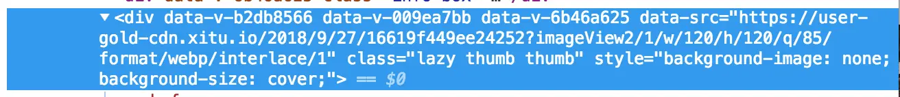 大家现在以尽可能快的速度,疯狂向下拉动页面。发现什么?是不是发现我们图示的这个图片的位置,会出现闪动——有时候我们明明已经拉到目标位置了,文字也呈现完毕了,图片却慢半拍才显示出来。这是因为,掘金首页也采用了懒加载策略。当我们的页面并未滚动至包含图片的 div 元素所在的位置时,它的样式是这样的: