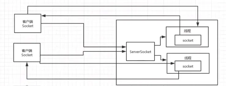 服务端创建一个ServerSocket,客户端就有一个Socket去链接这个ServerSocket,然后ServerSocket接收到客户端的Socket请求之后就会建立一个专属的Socket+线程去和客户端的Socket去通信(长时间维护)