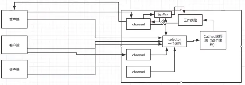 通过一个线程轮询大量的channel,每次获取一批有事件的channel,然后对每个请求启动一个线程进行处理,并设置一个线程池,当线程处理完毕以后,就回收线程,就不会像BIO需要一直维持为每个客户端创建的Socket+线程。