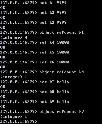 共享对象的引用次数可以通过object refcount命令查看,如下图所示。命令执行的结果页佐证了只有0~9999之间的整数会作为共享对象。