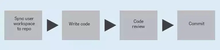 开发者先创建文件的本地拷贝,这叫做”工作区”(workspace)。完成开发后,工作区的快照共享给其他开发者进行代码评审。只有通过了评审,代码才能合并到中央仓库。