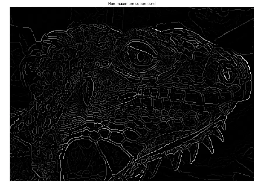 具体操作:1.筛选幅值大于阈值的像素点,设为待验证点;2.遍历待验证点,若为局部最大值,保留,反之去归零;3.保留下来的点就是非极大值抑制后的边缘点。