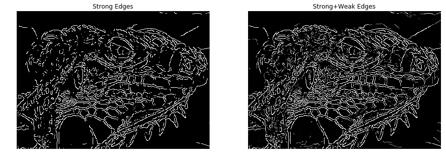 而在双阈值图像中,较亮的线条为强边缘,稍暗一些的线条为弱边缘。不难发现,一条不与强边缘相连的弱边缘,基本都是被误判为边缘的区域。相反,与强边缘相连的弱边缘,则囊括了绝大多数单阈值所没有判定包含的“真实边缘”。