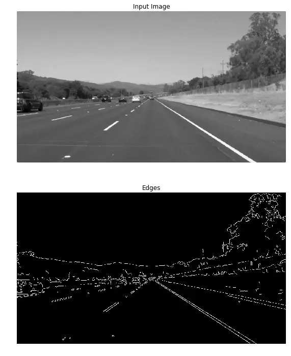 通常而言,车道都是细长的直线,并且具有较高的亮度。这种条件保证了它能被我们的算法较好地检测出来。运行下面代码,载入图片并检测图片中的边缘。