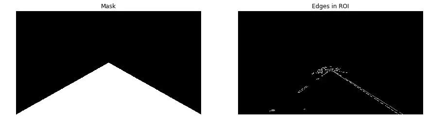可以发现,Canny算法能够找出图片中的道路。但是,我们也可以看到这里面出现了很多我们不需要的物体的边缘。考虑到所抓取的图片的空间位置,我们清楚道路总是在图片的下半部分,因此可以利用这一点消除一部分不希望得到的边缘。下面的代码定义了一个二值化的模板(mask),用来抓取ROI(Region of interest, 感兴趣区域)的边缘。