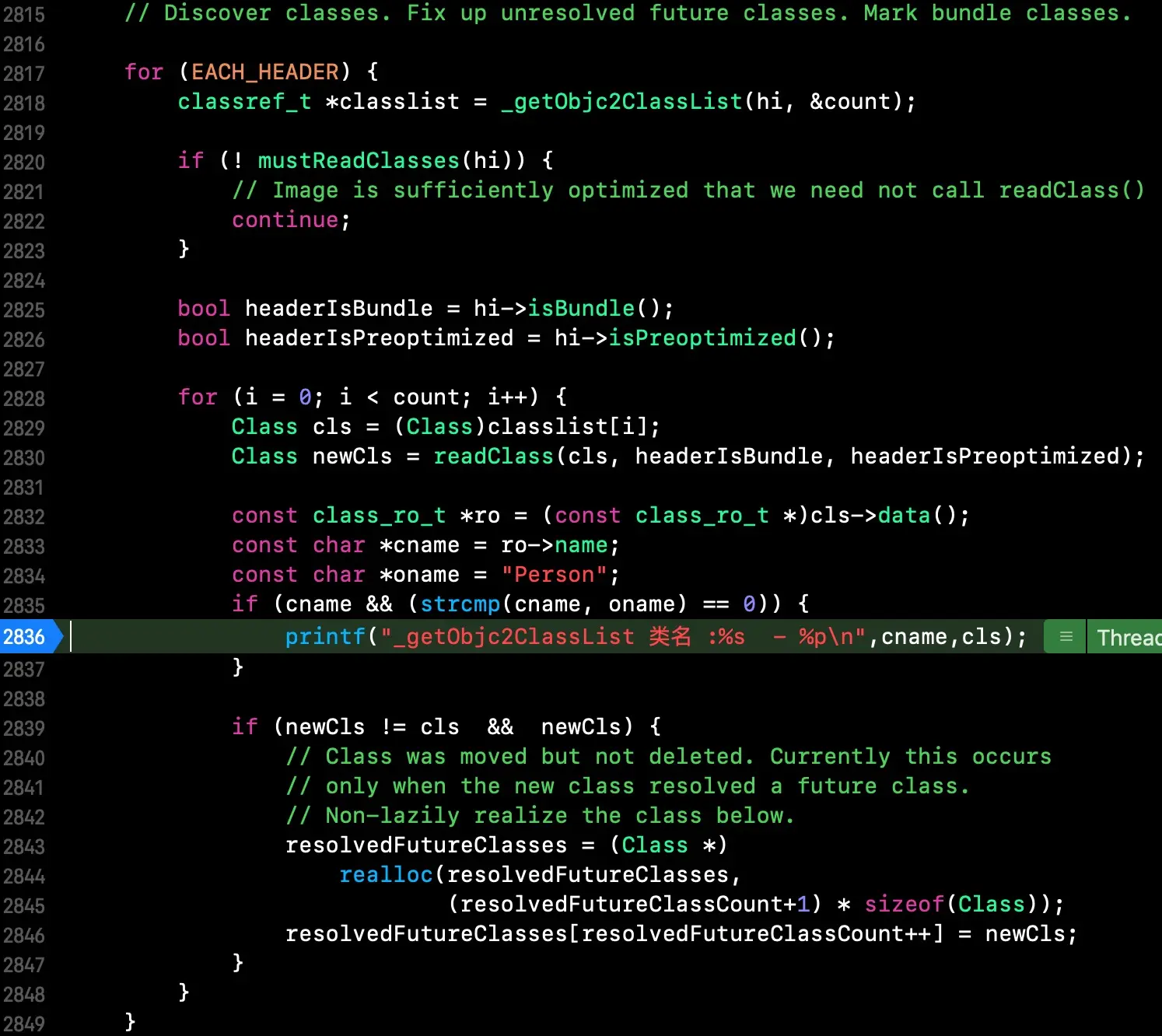 我们知道在数据很早的时候都会来到 read_images 里面来对类进行处理。 通过镜像文件来读取类的各种信息。那么我们就可以在 read_images 中来看一下类中是否有类拓展中相关的东西, 这样就可以知道类拓展是否是在编译器就加载的。