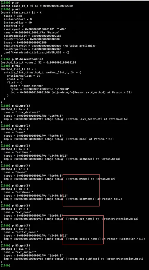 此时我们就可以通过lldb来看一下当前类中的ro中是否存在类拓展中的东西