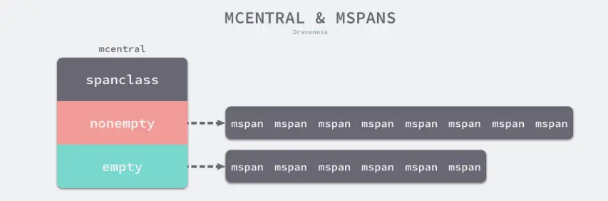 每个mcentral不仅包含了其类型还包含了两个mspan的列表。