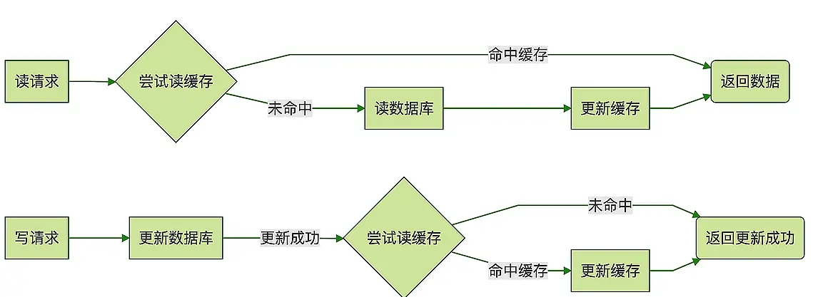 - 写数据,先更新数据库,检查缓存,命中,则更新缓存;不命中,不操作直接完成。