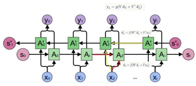 上图这种循环神经网络结构的一个缺点就是只使用了序列中之前的信息来做预测,而没有使用之后的信息。因为如果给定了这个句子,“Teddy Roosevelt was a great President.”,为了判断 Teddy是否是人名的一部分,仅仅知道句中前两个词是完全不够的,还需要知道句中后部分的信息,这也是十分有用的,因为句子也可能是这样的,“Teddy bears are on sale!”。因此如果只给定前三个单词,是不可能确切地知道 Teddy 是否是人名的一部分,第一个例子是人名,第二个例子就不是,所以你不可能只看前三个单词就能分辨出其中的区别。因此提出了BRNN来解决这个问题,BLSTM就是BRNN的典型代表。
