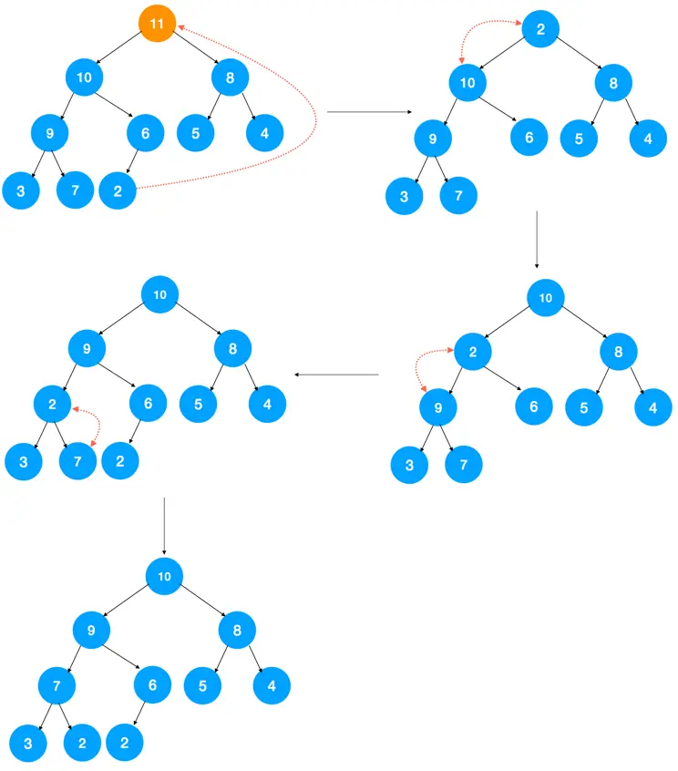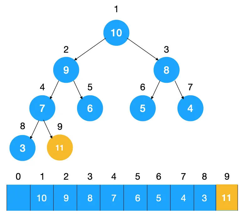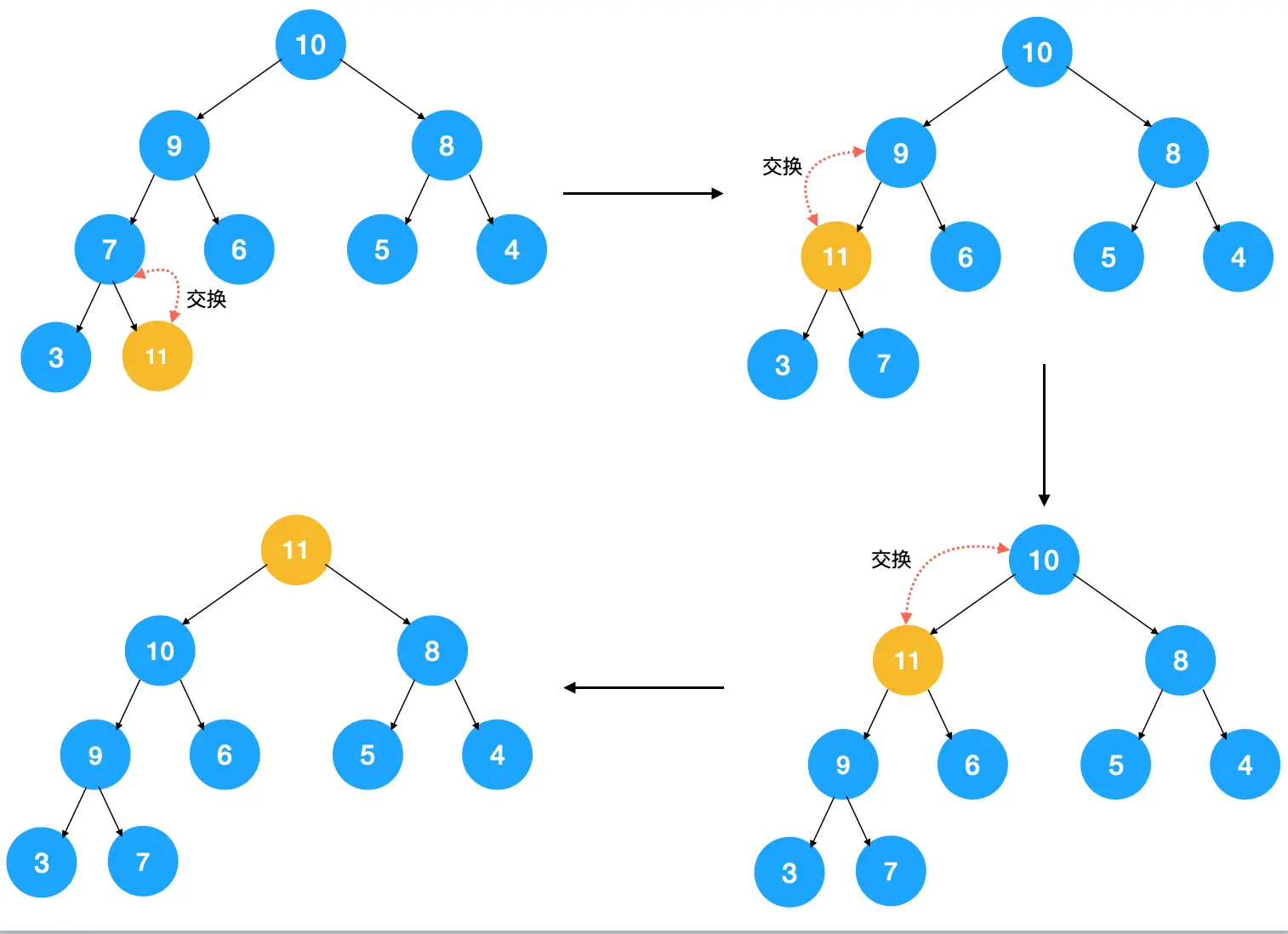 由于上图中的堆是个大顶堆,所以我们需要调整节点以让其符合大顶堆的特点。怎么调整?不断比较子结点与父结点,如果子节点大于父结点,则交换,不断重复此过程,直到子节点小于其父节点。来看下上图插入节点 11 后的堆化过程