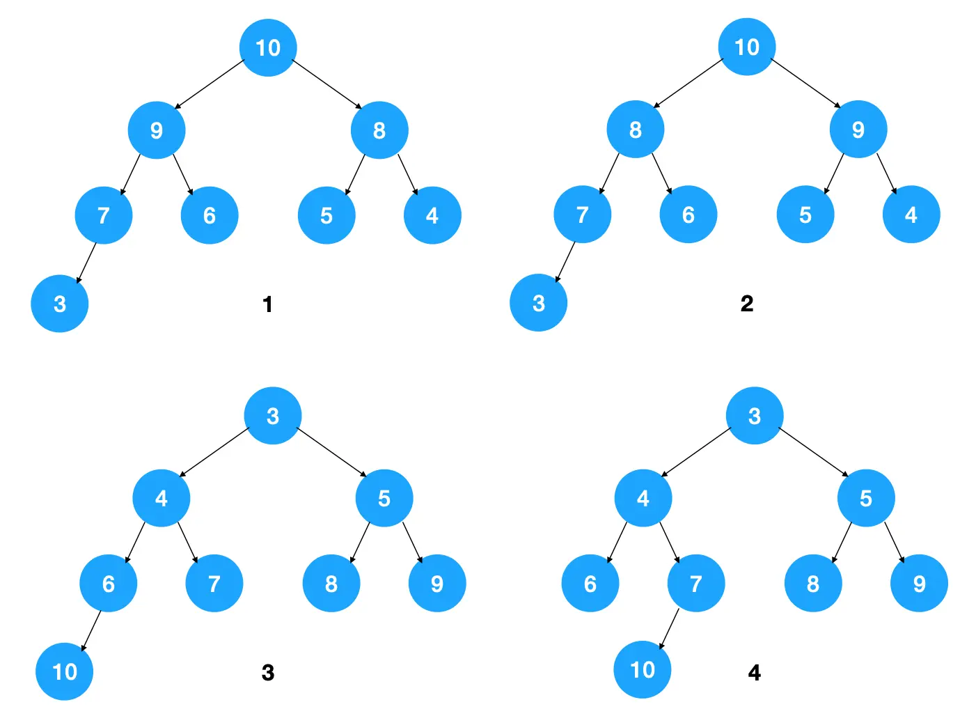 从堆的特点可知,下图中,1,2 是大顶堆,3 是小顶堆, 4 不是堆(不是完全二叉树)