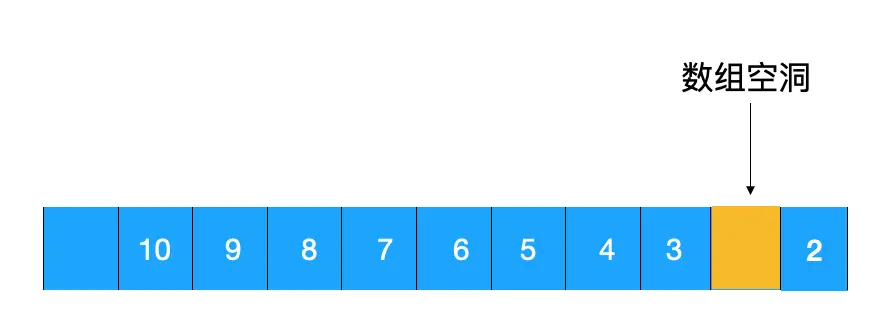 但是这么调整后,问题来了,如上图所示,在最终调整后的堆中,出现了数组空洞,对应的数组如下