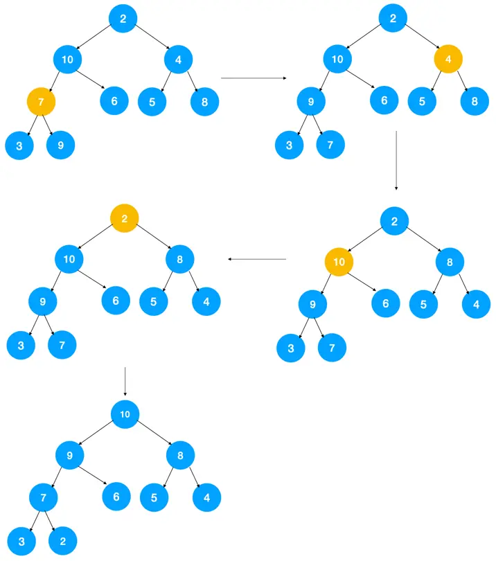 如图示:对每个非叶子节点自上而上调整后,最终得到大顶堆。