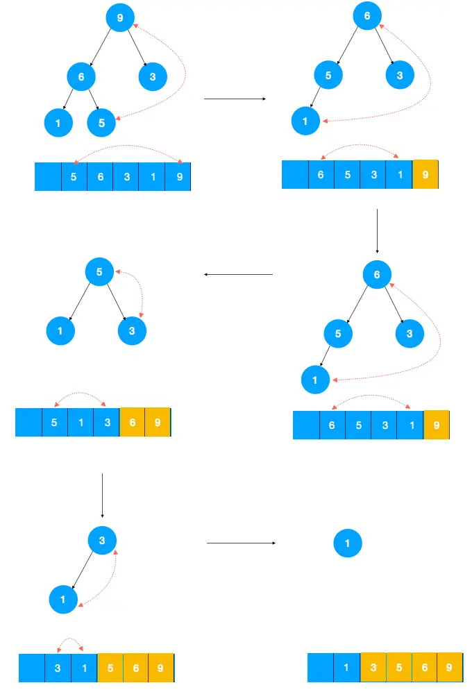 假设待排序元素个数为 n(假设其存在数组中),对这组数据构建一个大顶堆,删除大顶堆的元素(将其与数组的最后一个元素进行交换),再对剩余的 n-1 个元素构建大顶堆,再将堆顶元素删除(将其与数组的倒数第二个元素交换),再对剩余的 n-2 个元素构建大顶堆...,不断重复此过程,这样最终得到的排序一定是从小到大排列的,堆排序过程如下图所示: