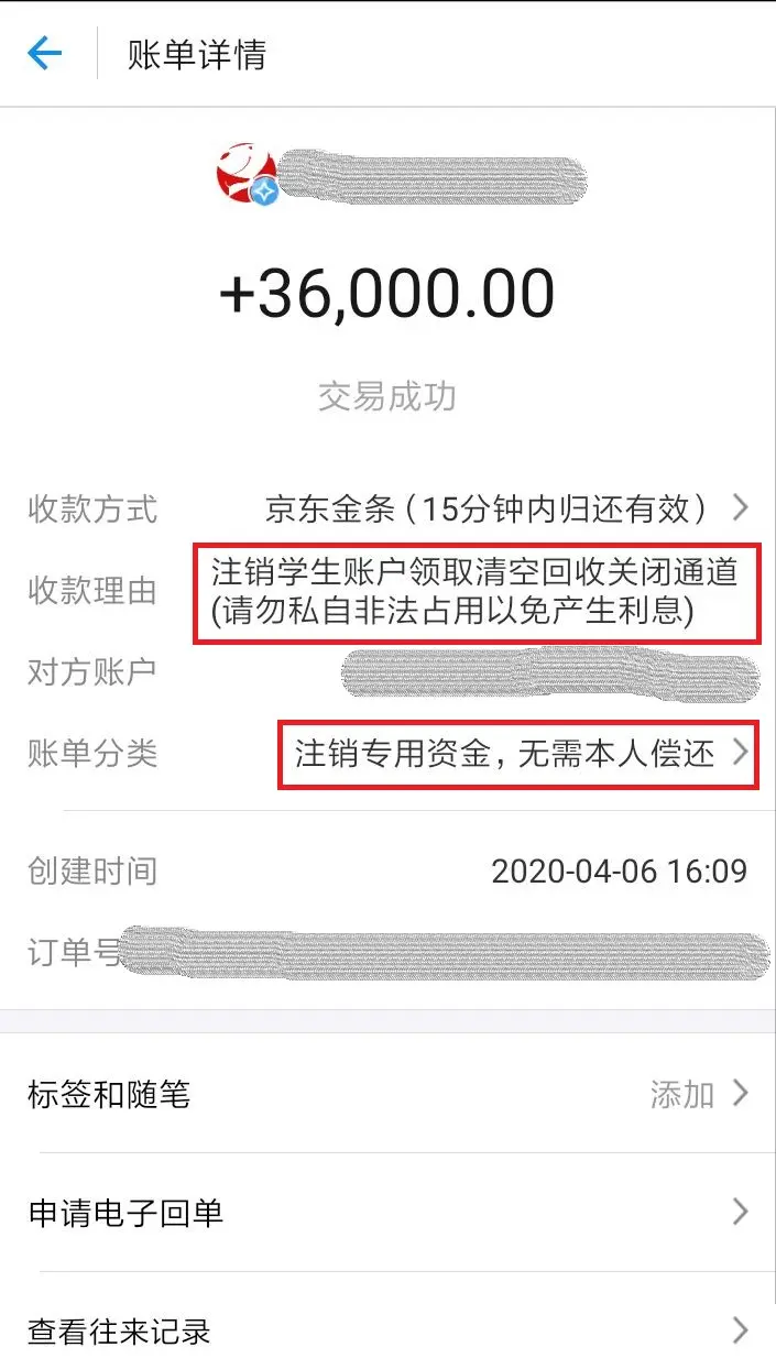 收款理由:注销学生账户领取清空回收关闭通道(请勿私自非法占用以免产生利息)