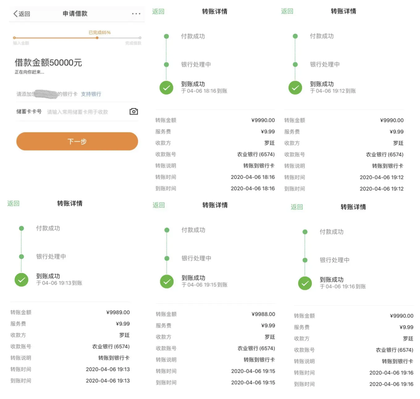 这一步之后,微博的 5W 额度到账,就这样,小 A 再次提现 5W,分 5 次转账。