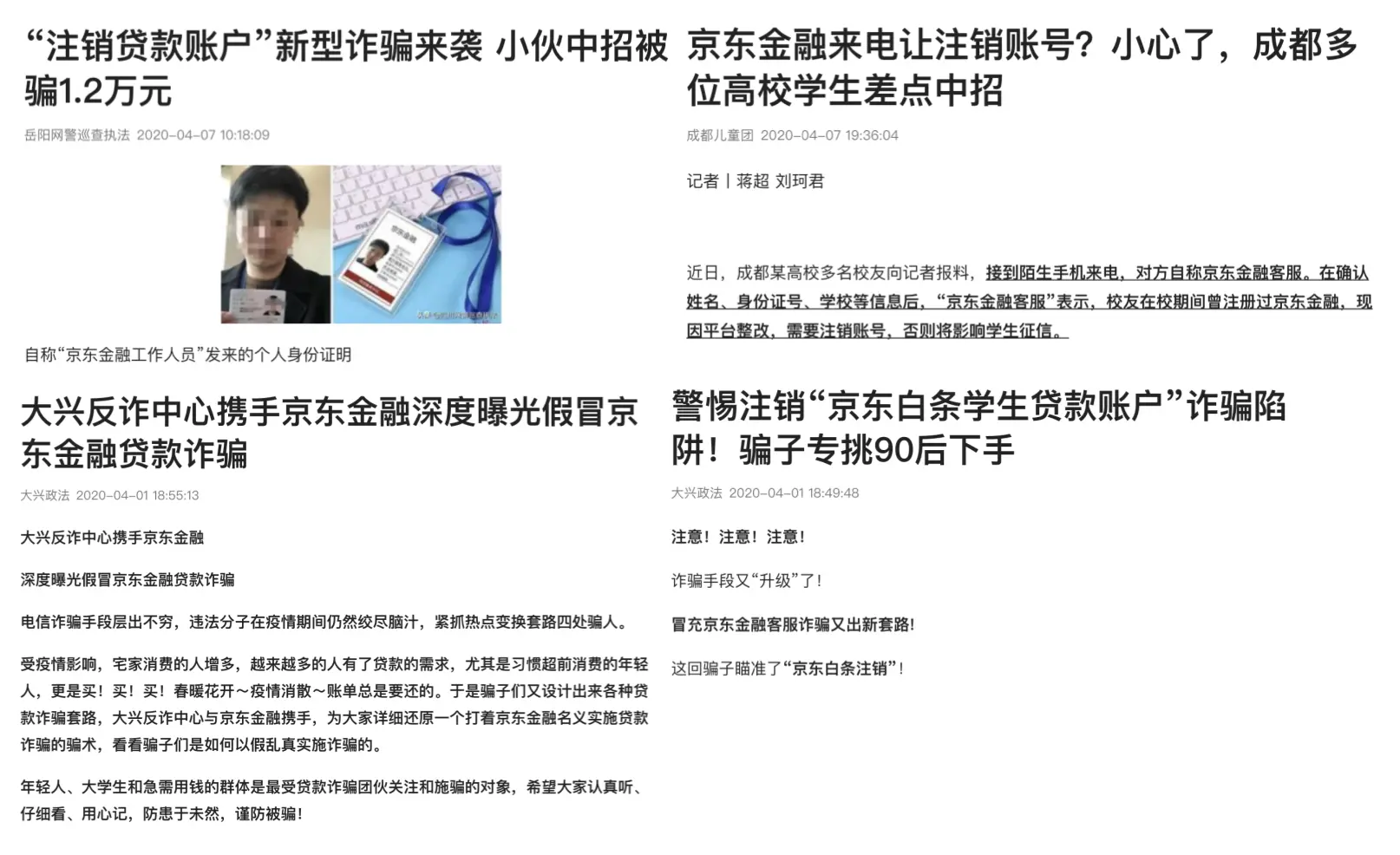 全国学生资助管理中心发出 2020 年第 1 号预警:声称贷款账户需要注销是新的诈骗手段。值得注意的是,骗子的诈骗对象中,有的是办理过贷款的,有的没有办理过。即使过往没有网络借贷经历,骗子也会称消费者的身份信息被盗用,有贷款记录,需要配合注销,否则会影响个人征信。