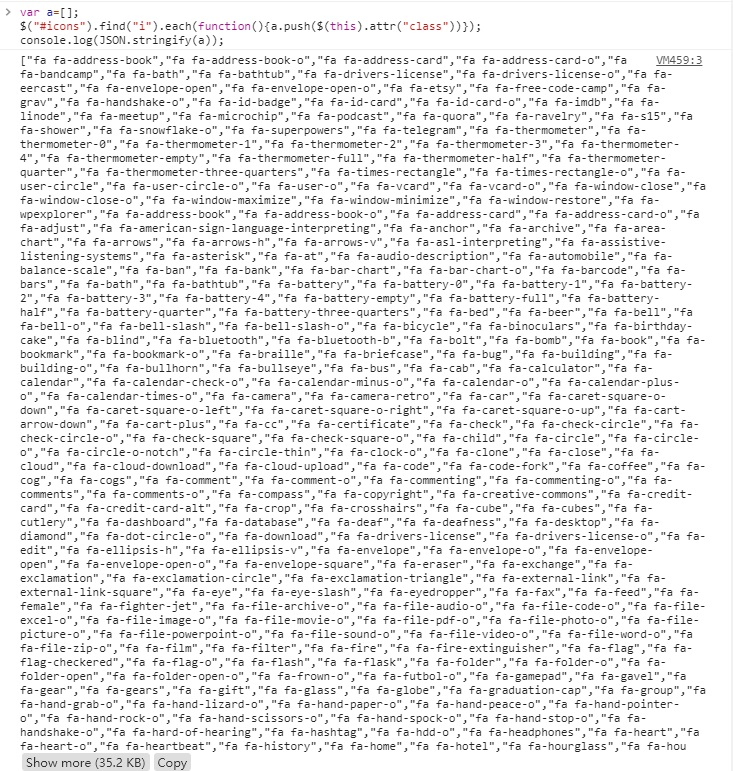 进入font-awesome中文网的图标库页面,我们可以通过F12看到图标的显示都在一个名为icons的DIV中,这时只需通过jQuery选取其中的所有图标名称即可,把它复制下来生成txt或者json,通过循环遍历的方式读取每个图标名称即可使用。