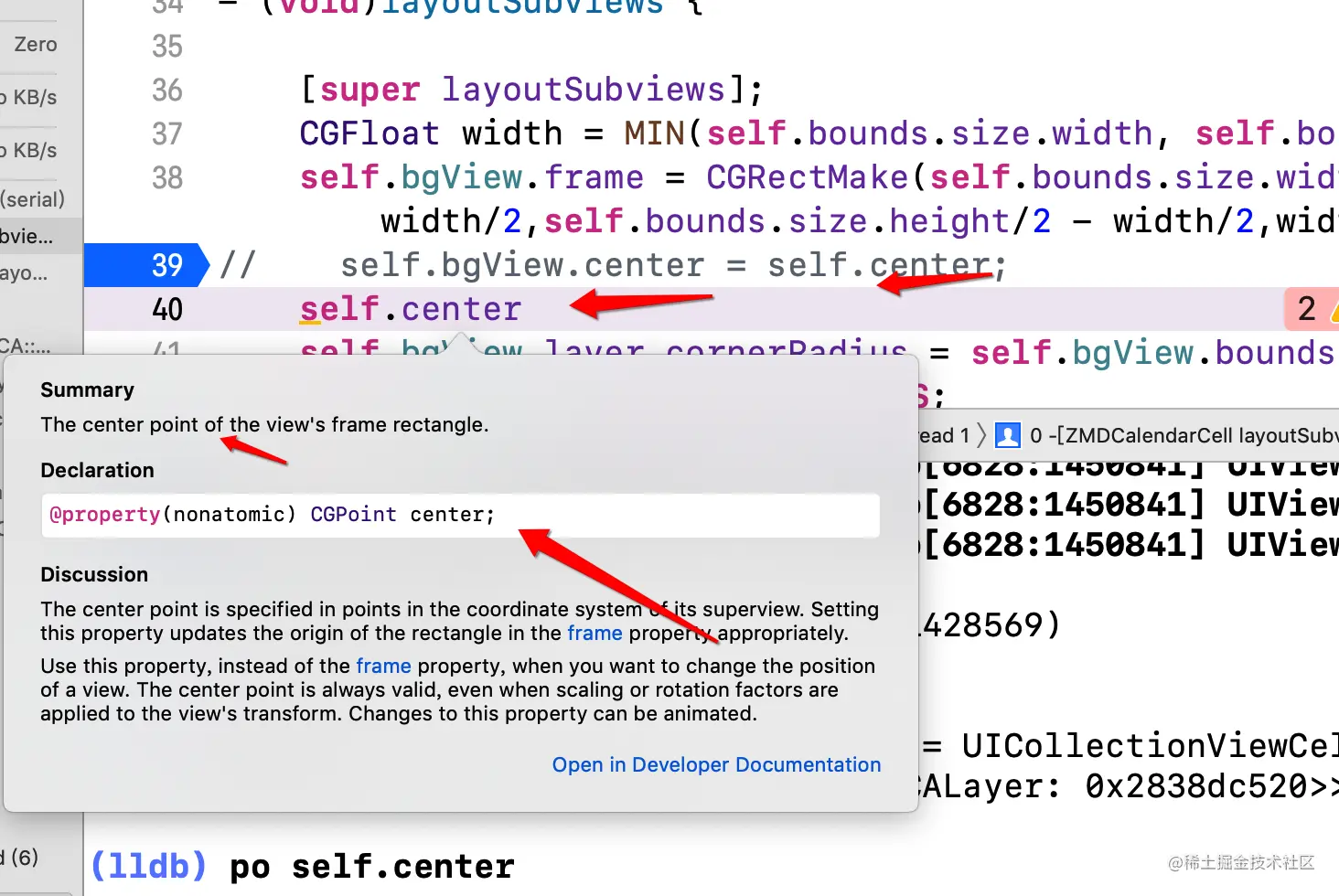 不对,因为看截图中center的含义,center指的是frame的中间位置,b的center的x值是(b.x+b.width/2),所以上边的写法是错的。