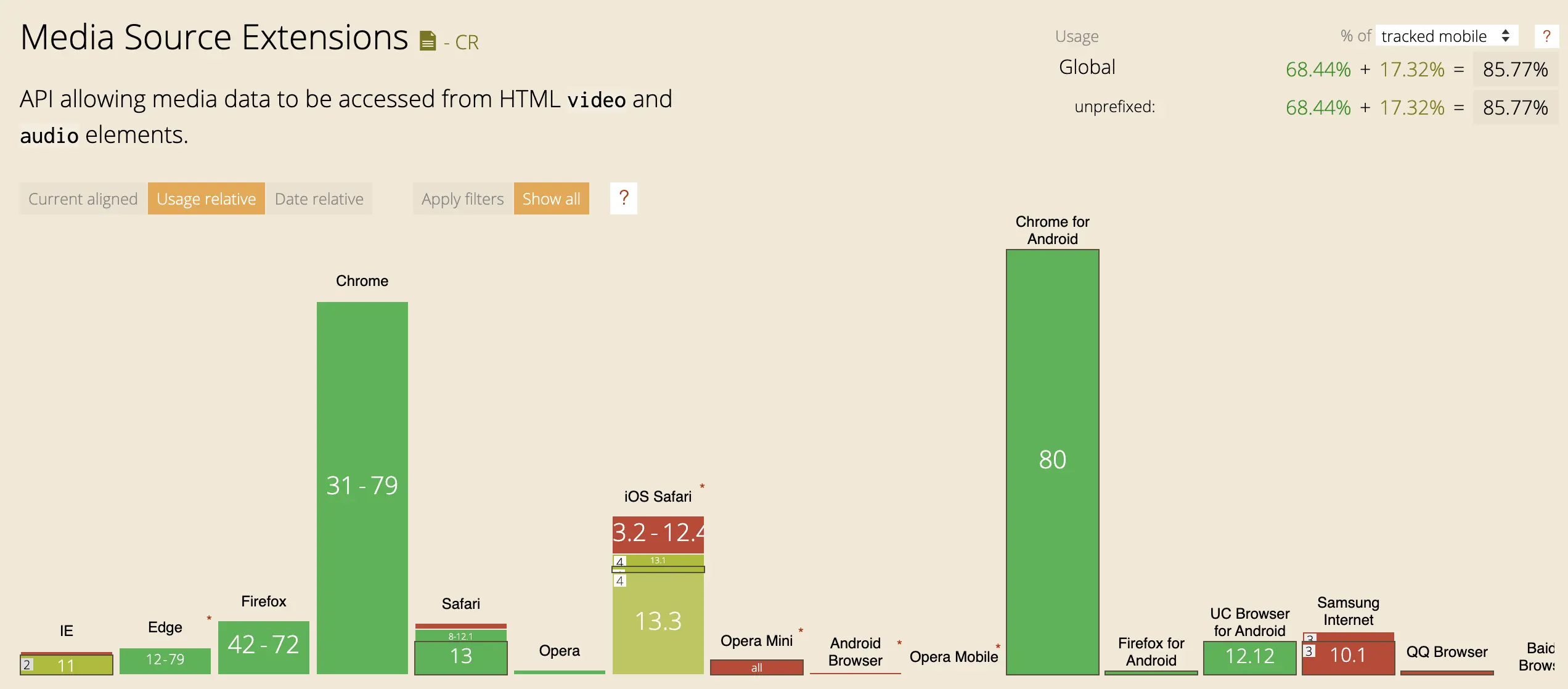 下图是 MSE 目前的兼容性概览,另见 Caniuse - MediaSource: