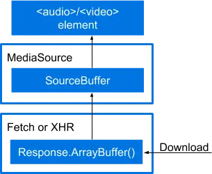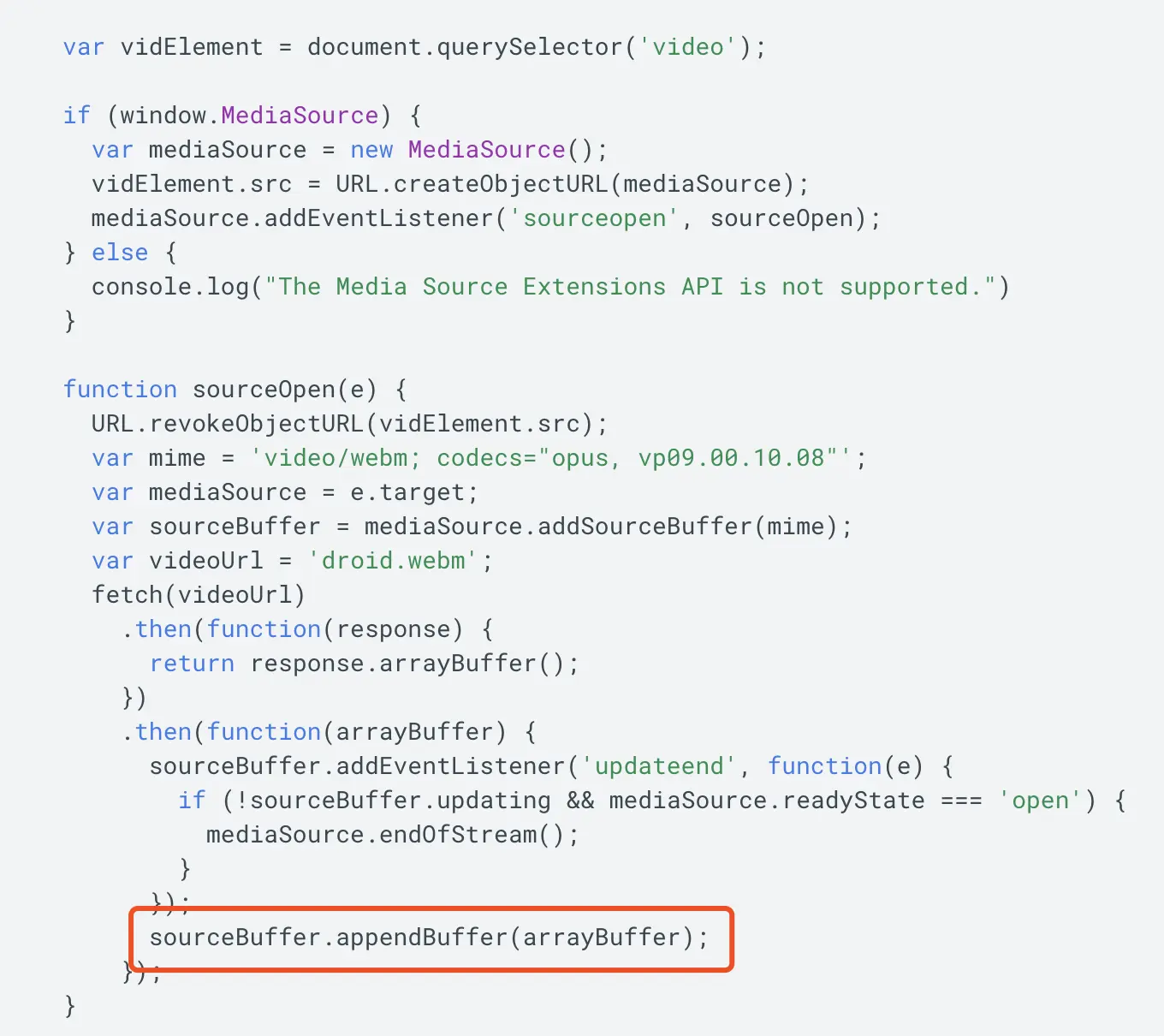 应用代码加载了分段的数据,然后调用 appendBuffer 将数据通过 Media Source 传递给音视频播放器。