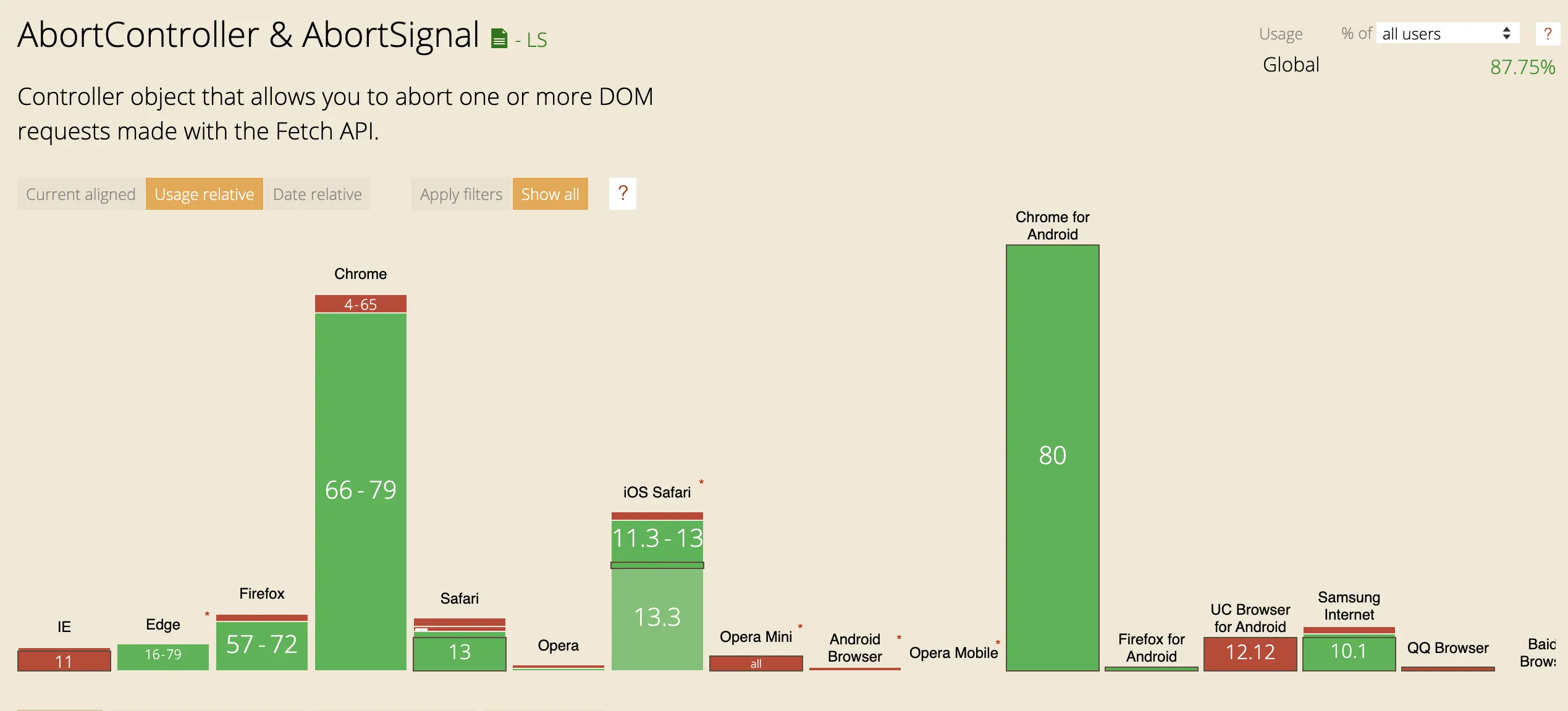 下面是 AbortController 目前的兼容性概览,另见 Caniuse - AbortController: