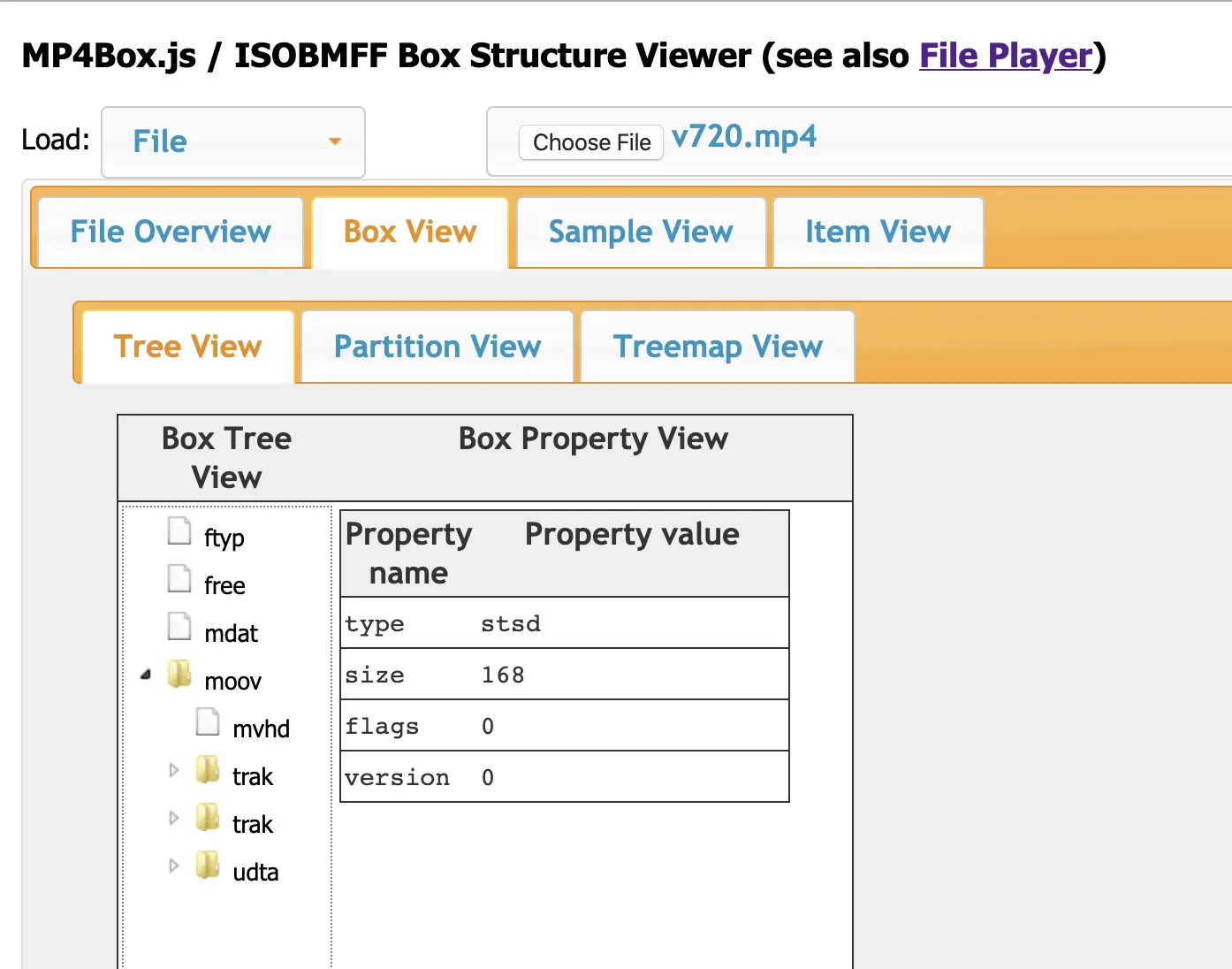 可以通过 MP4Box.js 提供的在线工具,放入这段演示视频,来查看 MP4 文件的结构信息:
