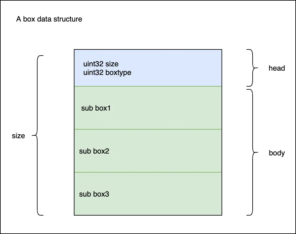 盒子的数据整体可以分为 head 和 body 两部分,这样分类虽然不是协议内规定的,但却是一个方便理解的方式。需要注意的是头部中的 size 数据,它表示的是整个盒子所占的数据大小。这样的设计使得客户端在快速的在盒子之间进行偏移,并且只选择自己感觉兴趣的部分进行延迟解析。