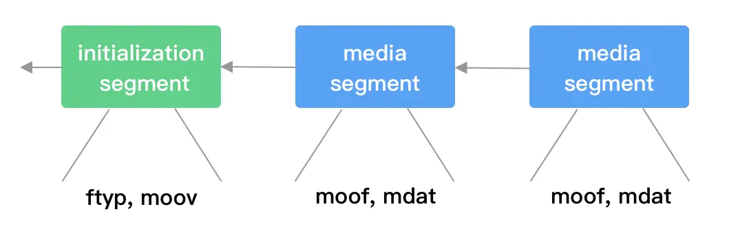 上图展示了 MSE-FORMAT-ISOBMFF 中的两个主要分段类型:initialization segment 和 media segment。这些分段又由一些盒子组成。