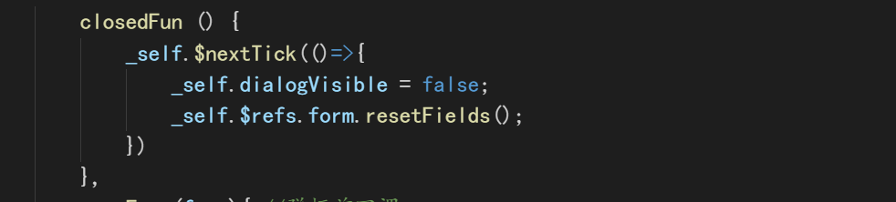上图中的nextTick,则可以在回调中获取更新后的DOM(dom的改变是发生在nextTick()之后),这个方法作用是当数据被修改后使用这个方法,我加这个方法是因为我的resetFields()方法报错,朋友说加这个就可以了