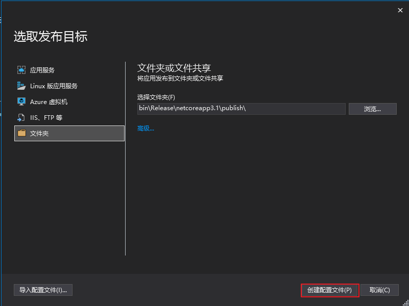 2、在【选取发布目标】对话框中,选择【文件夹】,点击【高级】