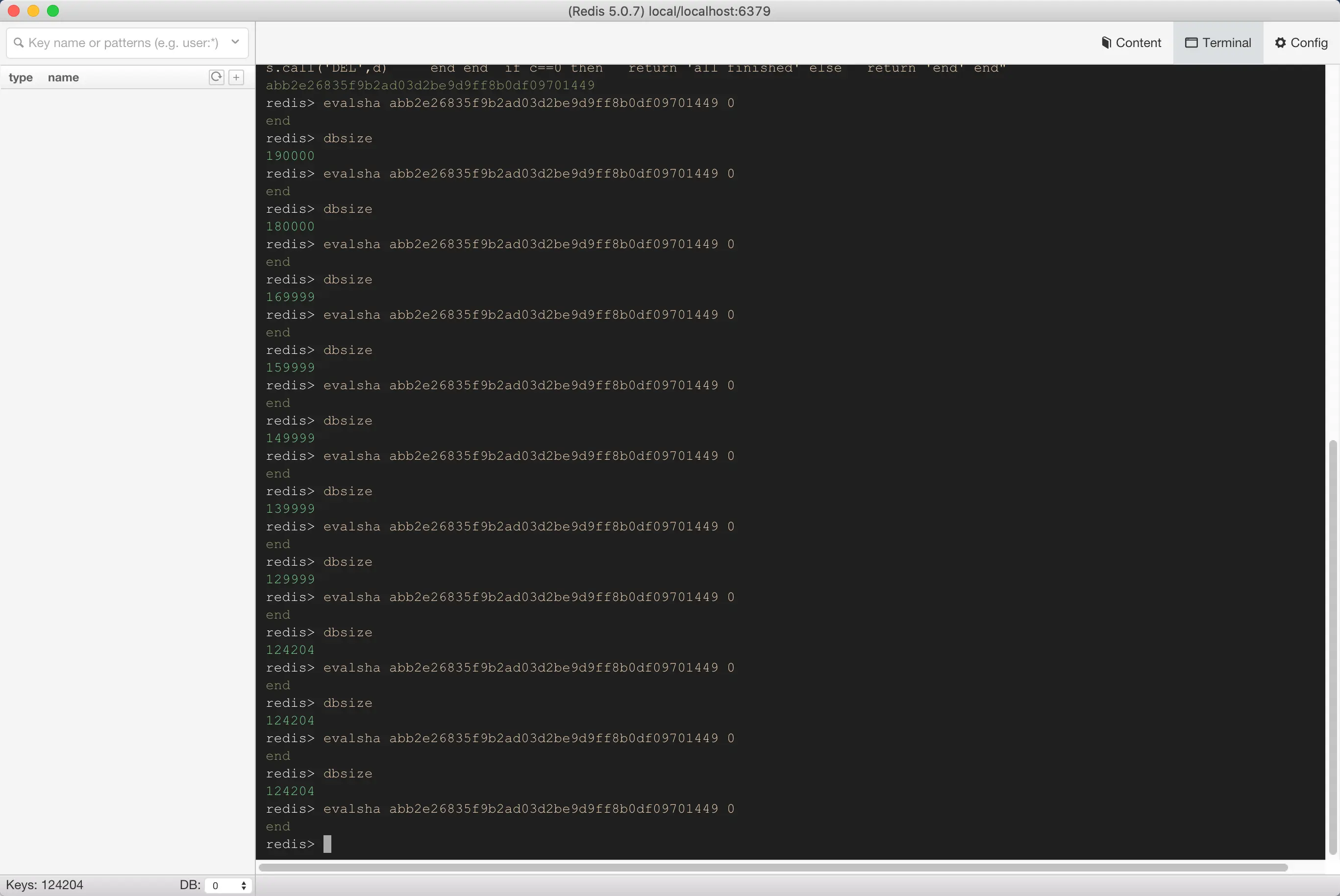 奇怪的是,前面几行都是正常的。但是到了第三次的时候,dbsize变成了16999,多删了1个,我也没太在意,但是最后在dbsize还剩下124204个的时候,数量就不动了。之后无论再执行多少遍,数量还依旧是124204个。