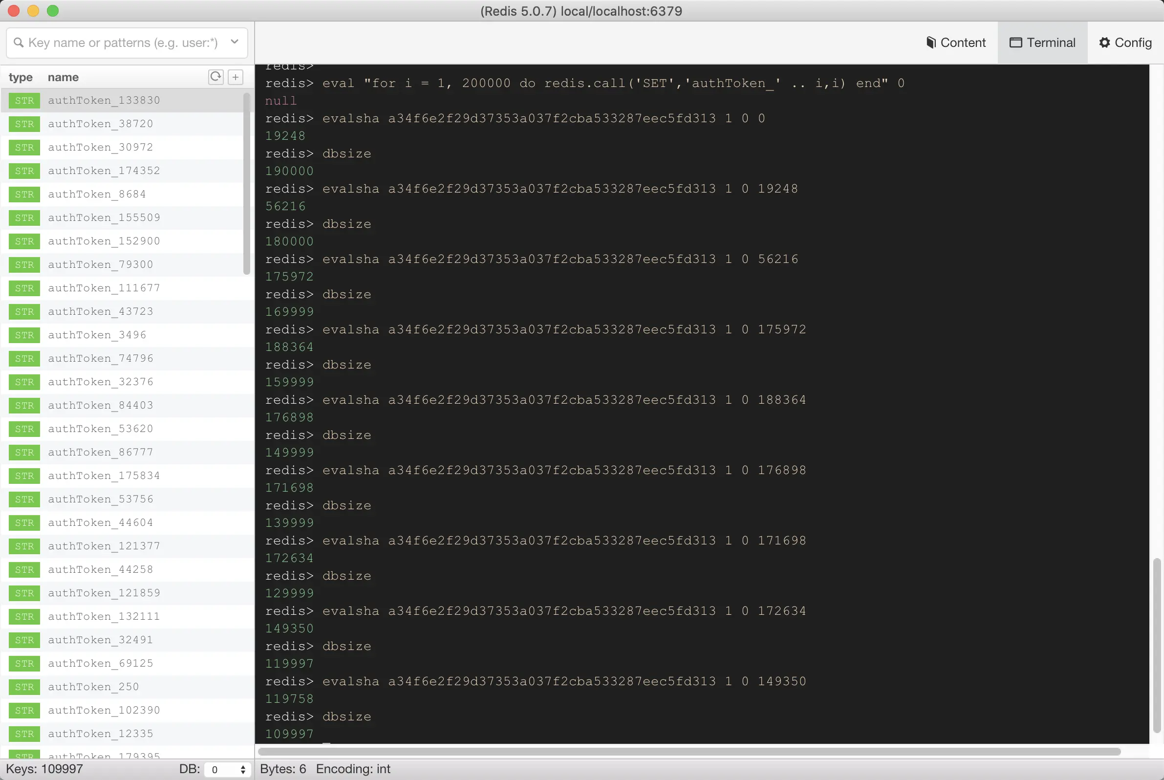 eval "for i = 1, 200000 do redis.call('SET','authToken_' .. i,i) end" 0