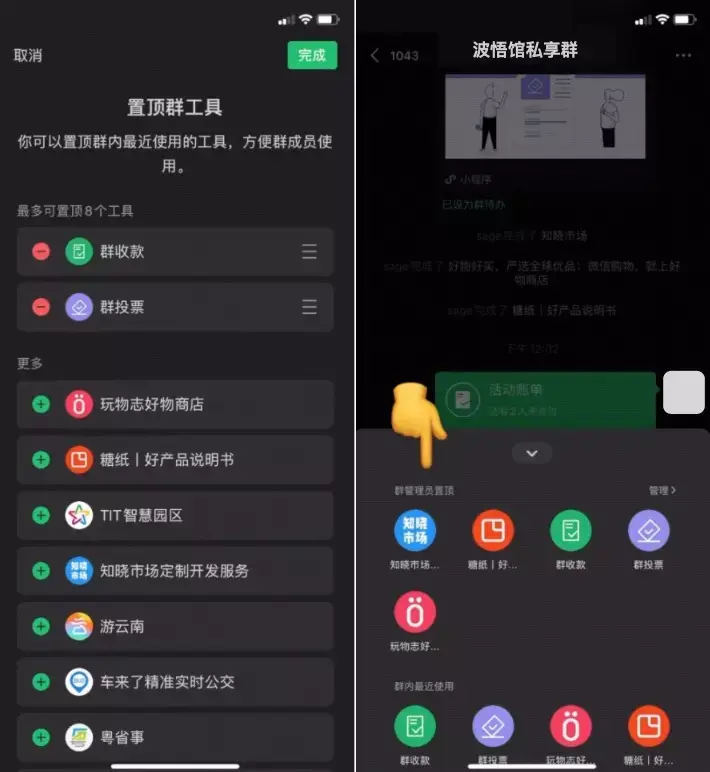 在这个面板中,群主/群管理员有「管理」入口,可以选择「置顶群工具」,最多置顶 8 个,且支持顺序调整,方便群成员使用。