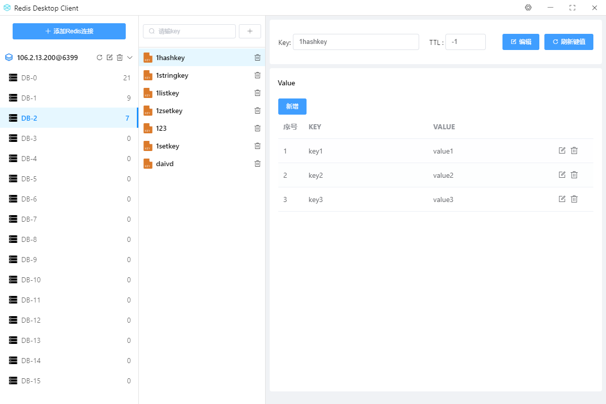 RedisDesktopClient是一款颜值较高、使用方便的redis客户端工具,可以使用该工具对redis进行新增key-value,修改key-value,删除key,修改key有效时间,同时也支持展示当前redis的详细信息,例如使用了多少内存,是否是单机模式等。