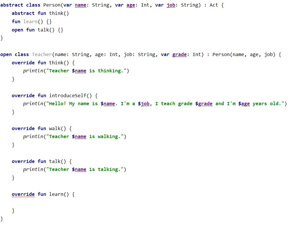 open class Teacher(name: String, age: Int, job: String, var grade: Int) : Person(name, age, job) {