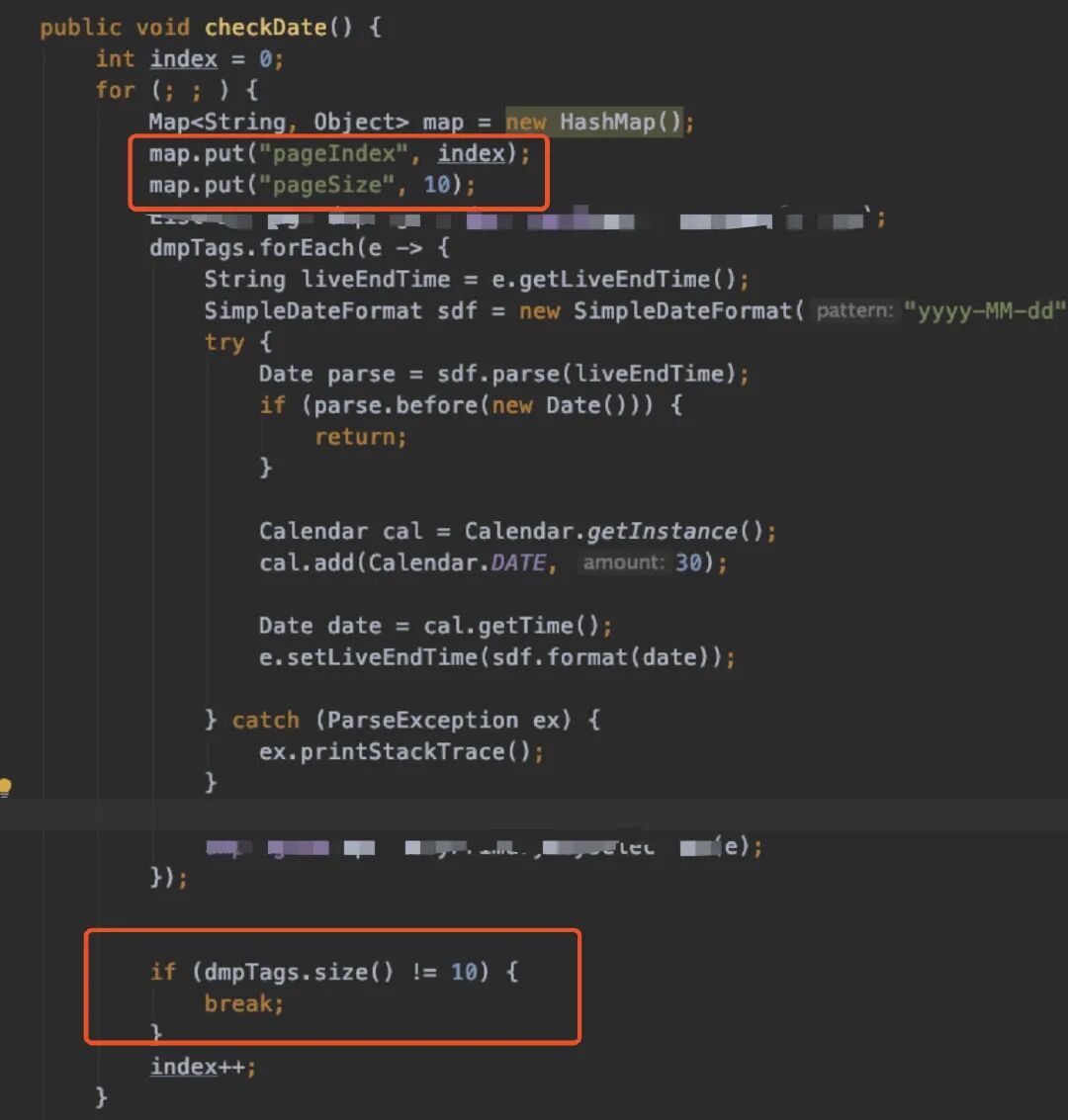 导致每次都能查出10个数据,在最后判断的时候就一直true不退出了,其实最后会退出,但是得循环很多次。