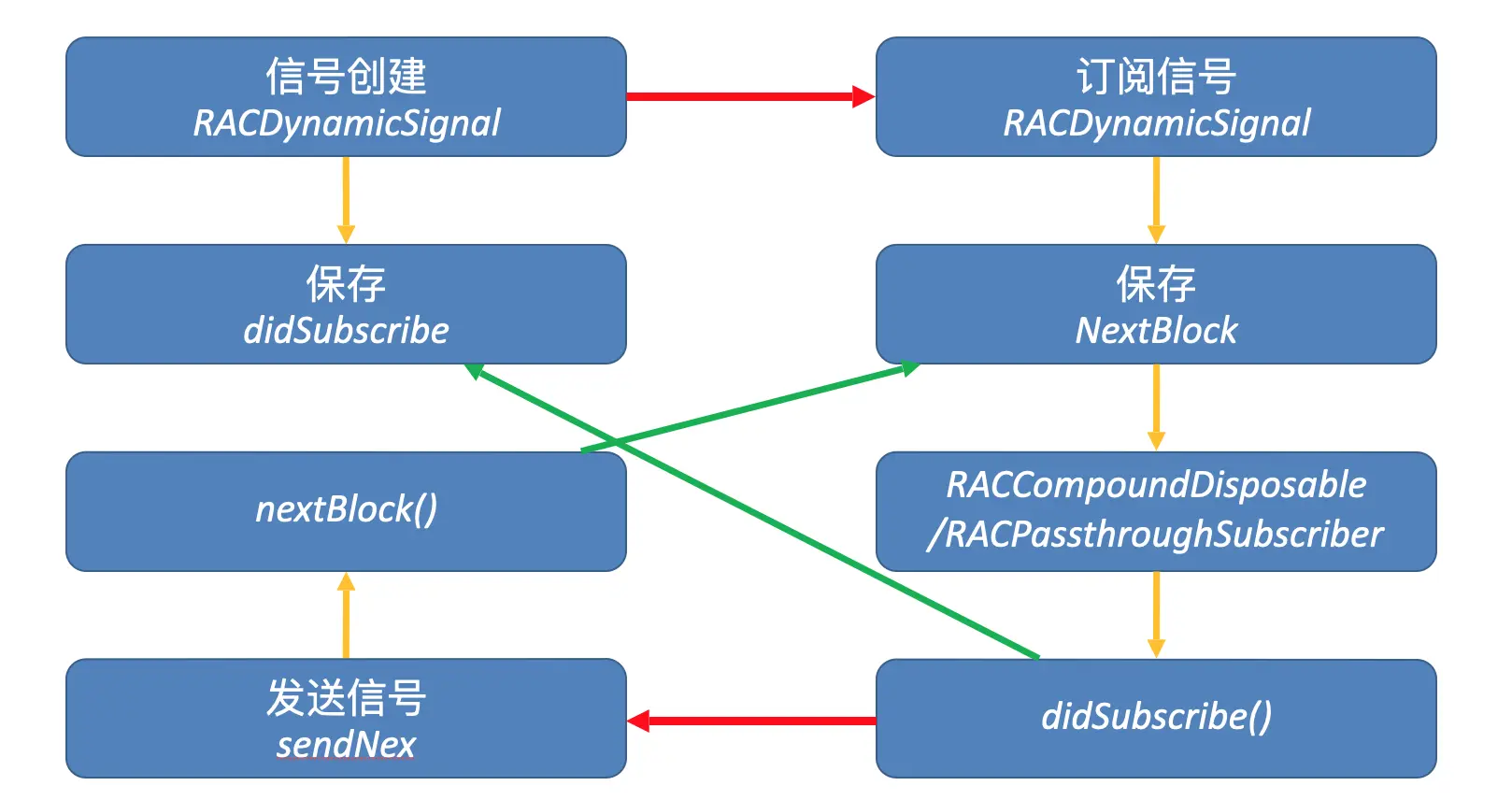 然后才会调用disposableWithBlock中的方法,即销毁信号。整个流程整理如下: