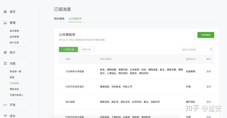 进入微信小程序后台,选择/添加小程序服务类目,微信将自动根据类目分配消息模板到你的公共模板库,你可在公共模板库中,选择合适的模板(或者申请新模板,申请新模板须审核后才可使用)。