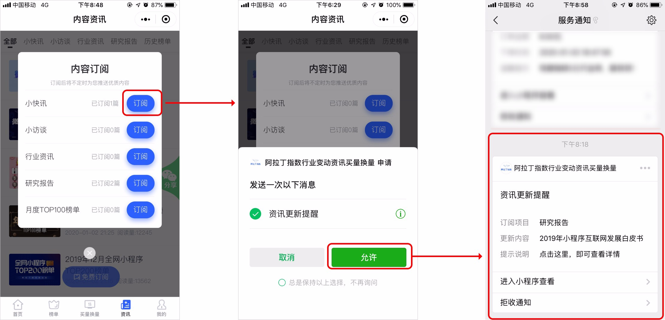 当用户在小程序内点击特定按钮后会弹出申请订阅弹窗,同意后小程序可在后续任意时间给该用户推送服务通知。较模板消息,订阅消息有如下几个特点:
