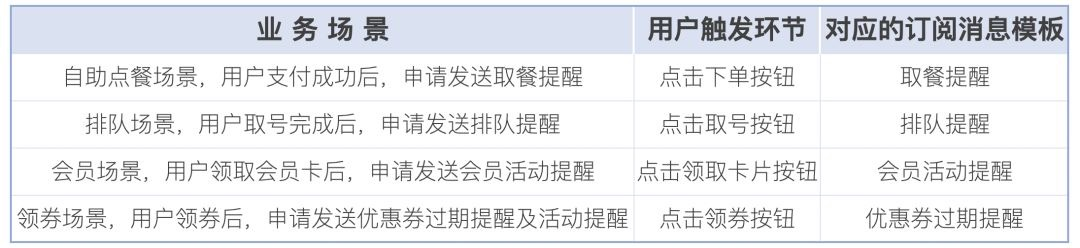 2.关于订阅内容:引导用户订阅跟用户当前的服务相关的模板消息,其他暂时用不到的模板建议等用户用到之后再订阅,以免用户产生误解而取消订阅;