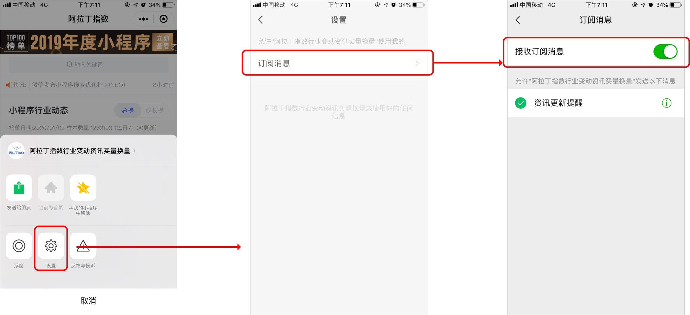 可引导用户点击小程序右上角“···”,进入设置页,点击消息订阅-点击接收订阅消息。