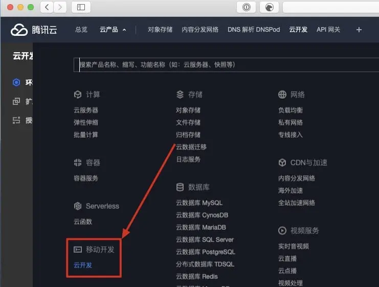 完成了本地的 Vuepress 建设,接下来我们来创建一个云开发环境,用来部署 VuePresss 。打开腾讯云控制台,在产品中找到云开发