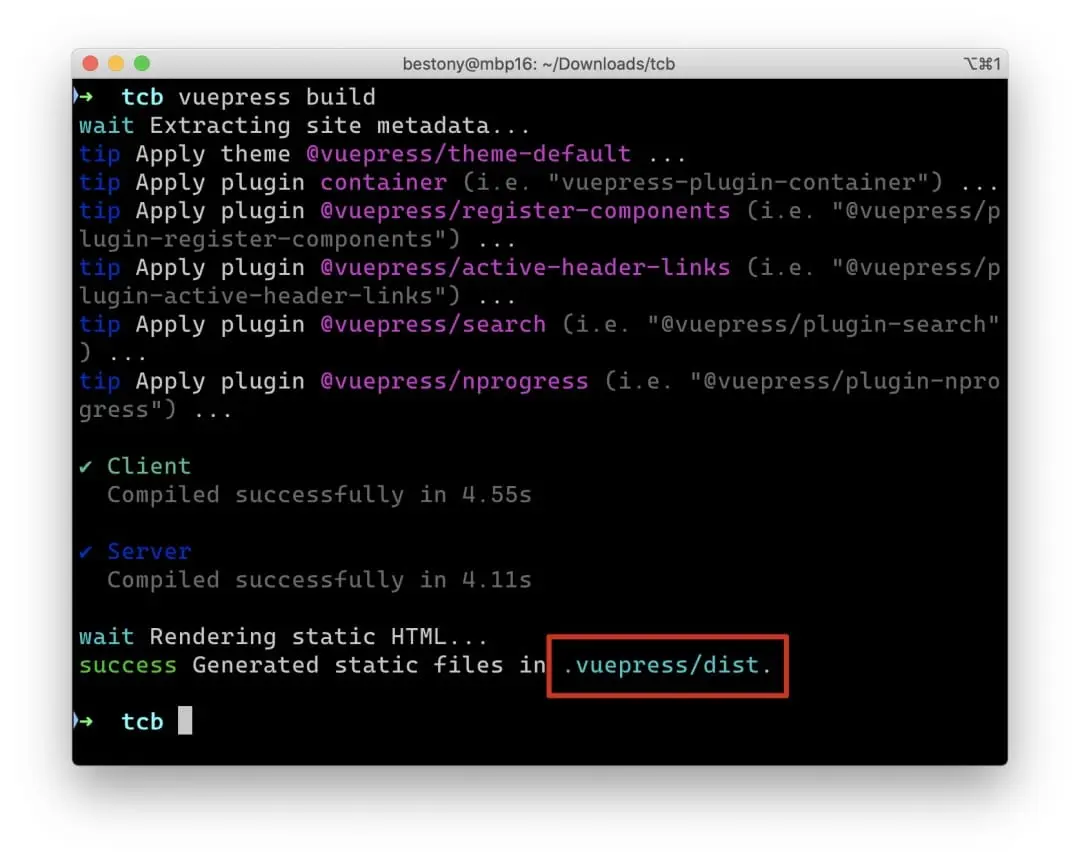 构建完成后,会提醒你,生成的静态文件在 .vuepress/dist
