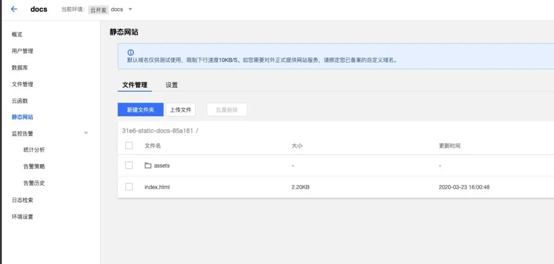 创建完成后,点击环境,进入到环境的管理页面。点击左侧菜单栏中的「静态网站」