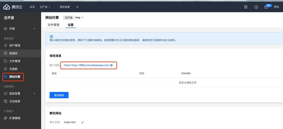 腾讯云云开发的静态网站托管有默认域名可供访问: