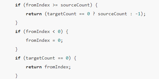 可以看到,其在内部调用了静态方法indexOf(char[] source, int sourceOffset, int sourceCount,char[] target, int targetOffset, int targetCount,int fromIndex),传入参数从左往右依次可以理解为源字符数组(标题中的第一个字符串),源字符数组偏移量(内部调用时默认传入0),源字符数组长度,要查找的字符数组(标题中的第二个字符串),要查找的字符数组偏移量(依旧是0),要查找的字符数组长度,以及初始匹配位置的下标。