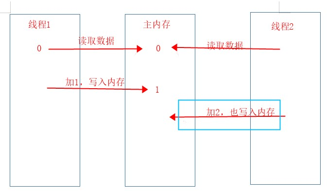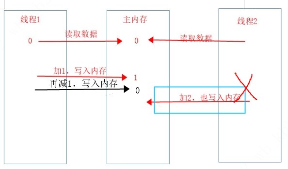 线程1和线程2同事获取了主内存变量值0,线程1加1并写入主内存,现在主内存变量值1,线程2也加2并尝试写入主内存,这个时候是不能写入主内存的,因为会覆盖掉线程1的操作,具体过程如下图。