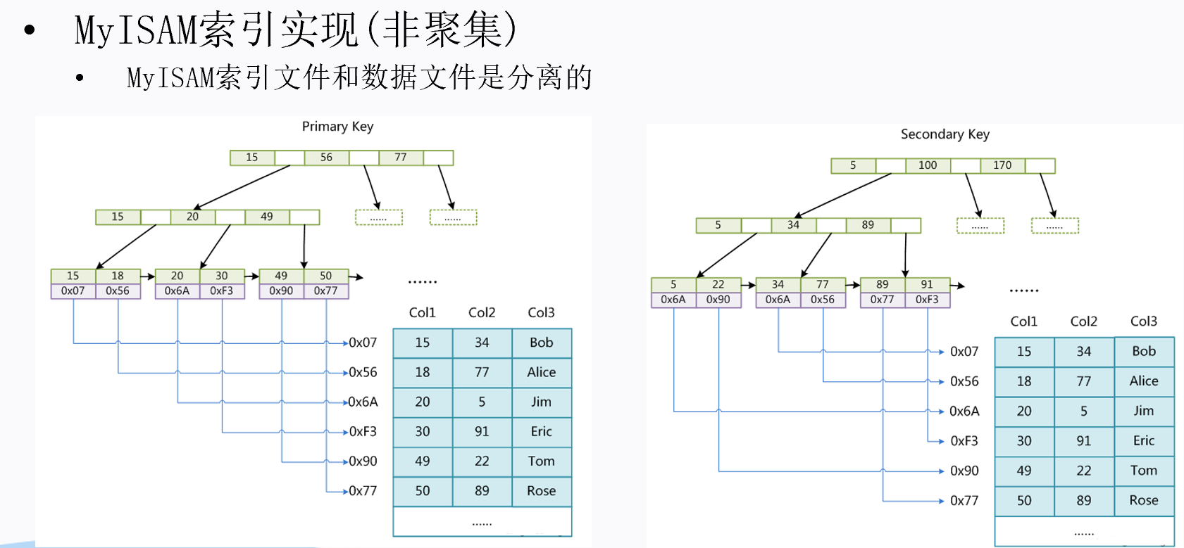 - B+树的叶子节点存储的是完整的用户记录,就是指这个记录中存储了所有列的值(包括隐藏列)